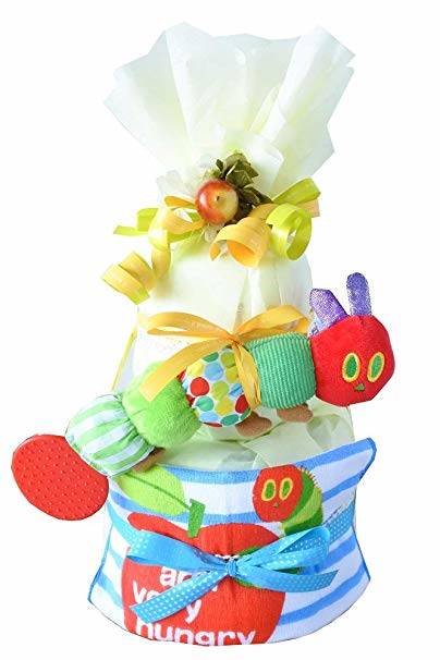 絵本でおなじみ「はらぺこあおむし」グッズはやっぱりおむつケーキでも人気です!色はオレンジ・ナチュラル・ピンクから選ぶことができるので、性別や好みに合わせて選ぶことができます。また、にぎって遊べるおもちゃとガーゼタオル付きで、ガーゼタオルの方は刺繍の名入れが無料でできるのでおすすめですよ。