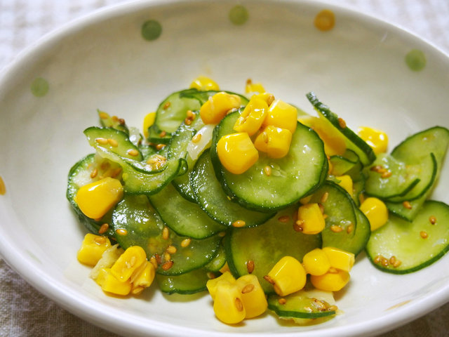 コーンときゅうりという、サラダの王道のような組み合わせの2つを使った、ナムルも作り置きメニューにぴったり。ナムルとは塩とごま油で和えた韓国の家庭料理です。