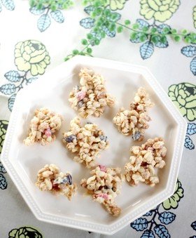 カラフルな色合いが楽しいフルーツグラノーラ。溶かしたチョコレートと混ぜて形を作り、固まったら完成です。形はスティック状にしたり、丸めたりと色々なアレンジで見た目も楽しそうになりますよ。