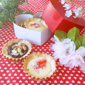 小さめのマドレーヌカップでタルト生地を作って、そこにチョコレートを流し入れナッツなどをトッピングしたら完成です。ホワイトチョコレートでも同じように作ると、さらにかわいい仕上がりになりそうですね。