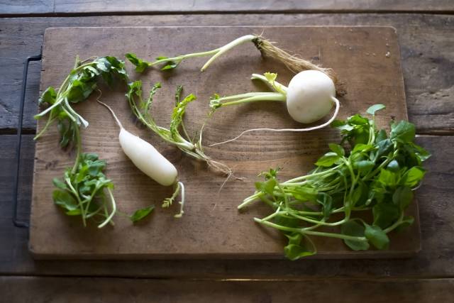 すずな(菘)は蕪(かぶ)のことをさしています。現代、蕪は根の部分を食べることが多いですが、昔は葉の方が重用されていたのだそうです。