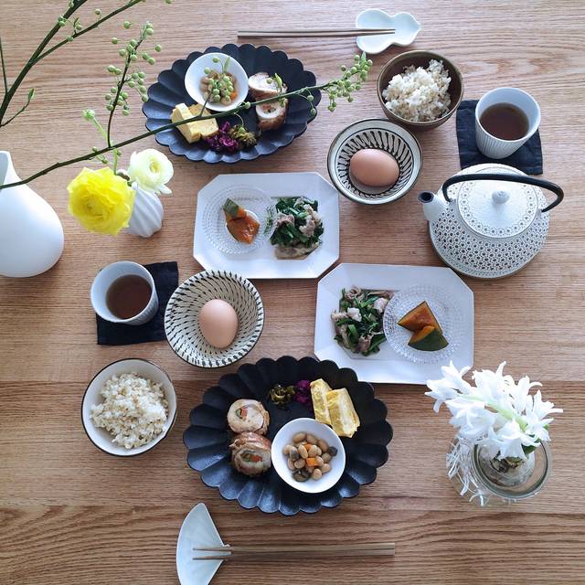 センス良く配置された和食のテーブルコーディネートです。南部鉄器や伝統的な焼き物のお皿など、とても趣がありますね。特に素敵なポイントをあげてみます。