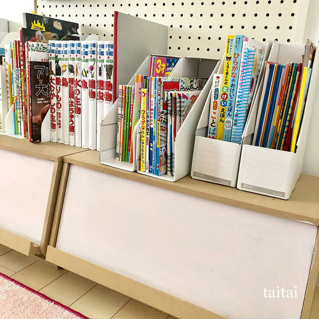 仕切りの少ない本棚の場合、絵本が倒れてしまったり、どこに戻していいか子どもがわからなくなって乱雑に突っ込んでしまうということもありますね。そんなときは、収納アイテムを少しプラスするだけでぐっと使いやすくなります。サイズ別、シリーズ別に分けてあげると、自分でお片づけをするのも簡単です。