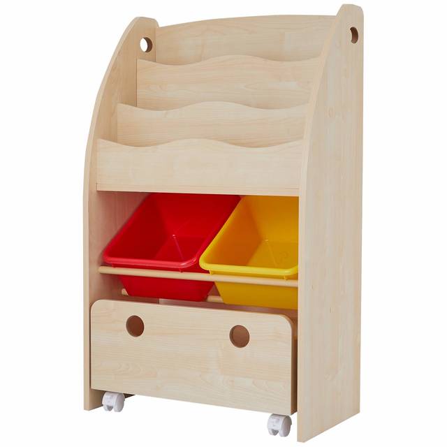 LOWYA (ロウヤ) おもちゃ収納 絵本棚 絵本ラック 本箱 おもちゃ箱 子供用 木製 スリムタイプ ナチュラル×レッド/イエロー