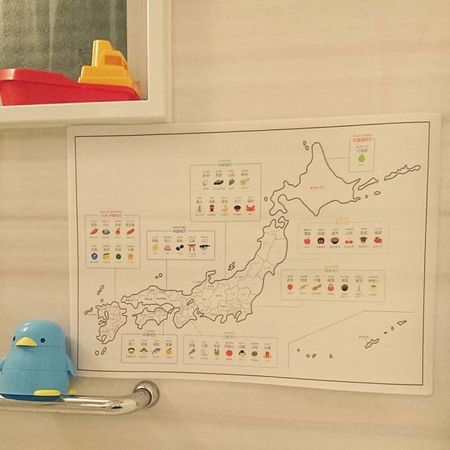 日本地図なので都道府県名はもちろん、その都道府県の特産品までが学べます。色もシンプルなので、どんなお風呂でも主張しすぎないところもおしゃれです。