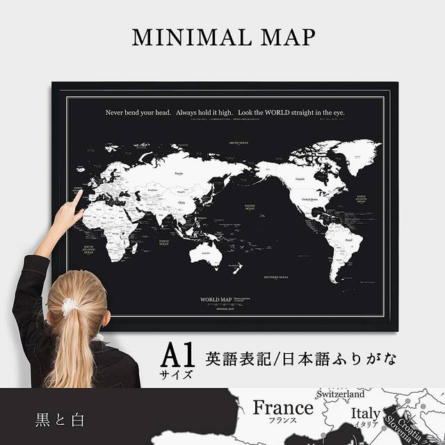 こちらもモノトーンの黒ベースの世界地図。よく見るとしっかりひらがなでも表記されているので、ひらがなが読める子どもなら、国名が読めます。子どもの興味を惹くのにぴったり。
