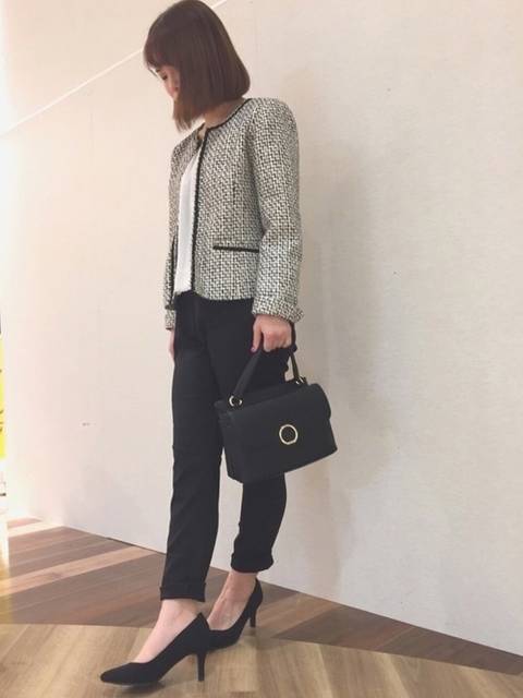 非常に人気のパンツスーツのアンサンブルセット。すっきりと細見えするのは、ブラックやネイビーの上下セットアップに、同系色のツイードジャケットを合わせたコーデ。上品さと大人っぽい印象を与えてくれます。