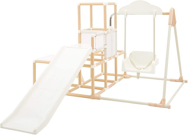 滑り台にジャングルジム・ブランコ・鉄棒がセットになってお得。周りのインテリアと調和がとれてリビングにおいても違和感がなさそうです。
