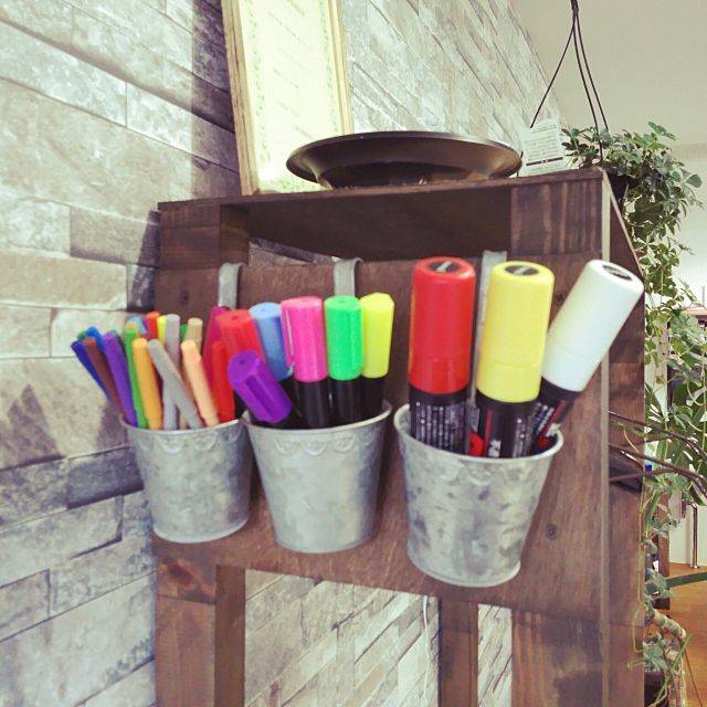 ラックにひっかけて収納されていますが、ペンが入っている容器はガーデニング用の吊り下げポットです。これなら、机の上などに置かずに収納ができるので、空いているスペースを有効活用することができますね。