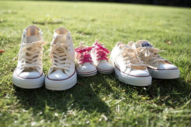 こちらは着用はしていませんが、パパとママと子どものスニーカーが3足揃っているだけでも素敵です。