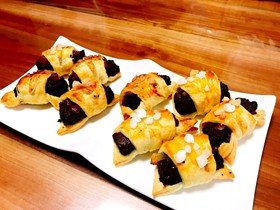 チョコレートケーキをパイで包んだアレンジレシピ。見た目もおしゃれで手が込んでいるように見えるのも魅力の一つ。サクッとしたパイ生地がしっとりケーキとの相性抜群ですよ。
