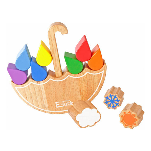 カラフルな雨のしずくの形の積み木が可愛い木のおもちゃ。バランスゲームをして遊んだり、積み重ねて遊んだりと遊び方が自由自在に楽しめます。