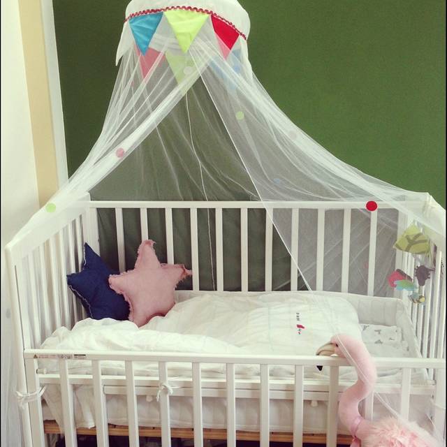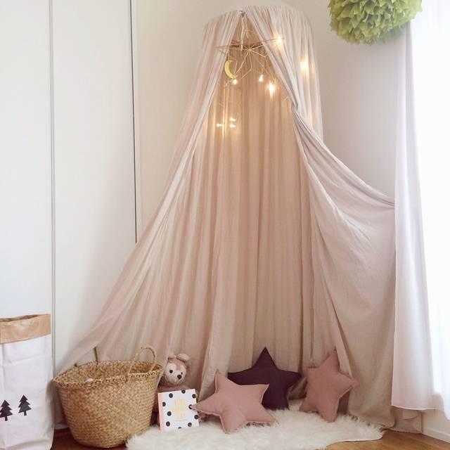 天蓋は空をイメージするので星の柄との相性が良いですね。他にも、雲や雨の形のメリーとも合いそうですね♡天蓋の周りに可愛い照明をつけると、雰囲気が出てとても可愛いですよね♪この中で、女の子はプリンセス気分を楽しめそうです!