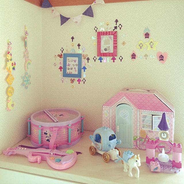 可愛く並べられたおもちゃにさりげなくガーランドが効いてますね♪ピンクと紫で可愛らしくまとまっていますね。全体的にまとめたいなら、このようにガーランドも色を揃えるとすっきりして見えるのでおすすめです♡
