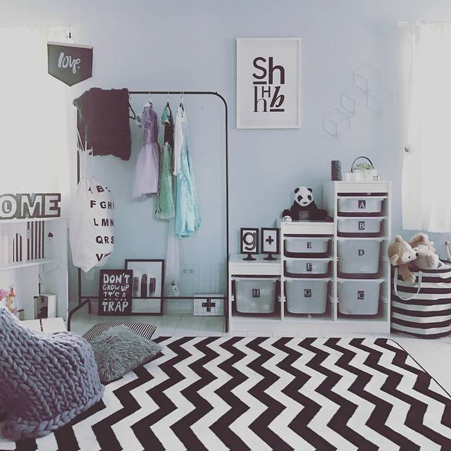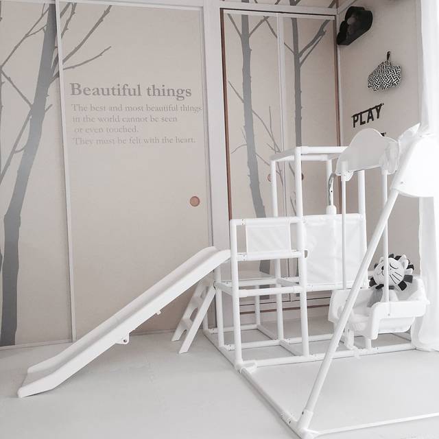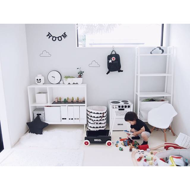こちらもモノトーンにパステルカラーの淡いピンクが、すっきりおしゃれにまとまっていますね♡こんな風に色味を抑えると、おもちゃや家具が多くなっても大丈夫なのが分かりますね。また、モノトーンだけにしてしまうと子供部屋なのでちょっと寂しく感じてしまうかもしれません。このように、モノトーンにする場合はあと一色足してみるのがおすすめです。