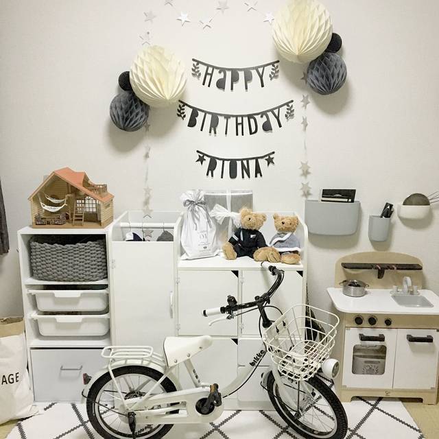 こちらも全体的にモノトーンでまとめられたおしゃれなお部屋ですね♪この日はお誕生日ということで、子供部屋に可愛く装飾されていますね。レターバナーだけではなく、左右に大きめの装飾をもってくると文字が引き立って見えますね♡おしゃれでなおかつ子供が喜びそうなので、ぜひ参考にしてみてください♪
