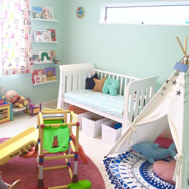こちらも壁付けされた棚に絵本がたくさん並べられていて、可愛くて楽しそうな子供部屋インテリアですね♡細かいおもちゃは収納され、大きいおもちゃだけが並べられているのでごちゃつき感がありません。全て収納してしまうと子供部屋が寂しくなりますし、飾りすぎてもおしゃれには見えなくなってしまうので、ちょうど良い量を見極めて飾ってみましょう♪